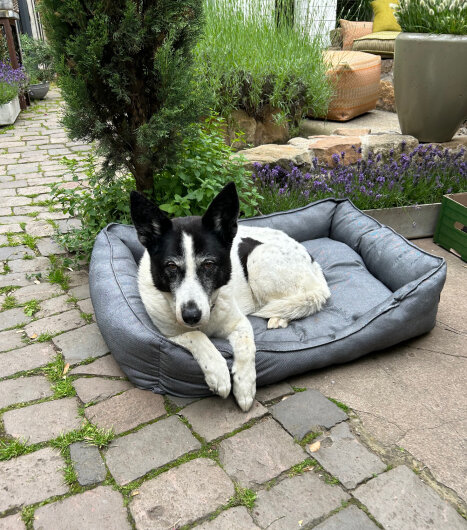 Der wasserabweisende Caribe-Stoff gewährleistet, dass Flüssigkeiten nicht sofort in das Material eindringen. Falls Ihr Hund also mal ein Missgeschick passiert, perlt es zunächst ab. Dank des speziellen Unterbezugs des Innenkissens zieht die Flüssigkeit nicht direkt in das Hundekörbchen ein, was die Reinigung erleichtert.