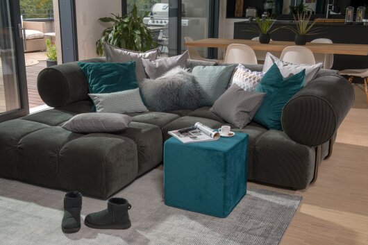 Der Bezug besteht zu 100% aus Polyester (changierender Samt).